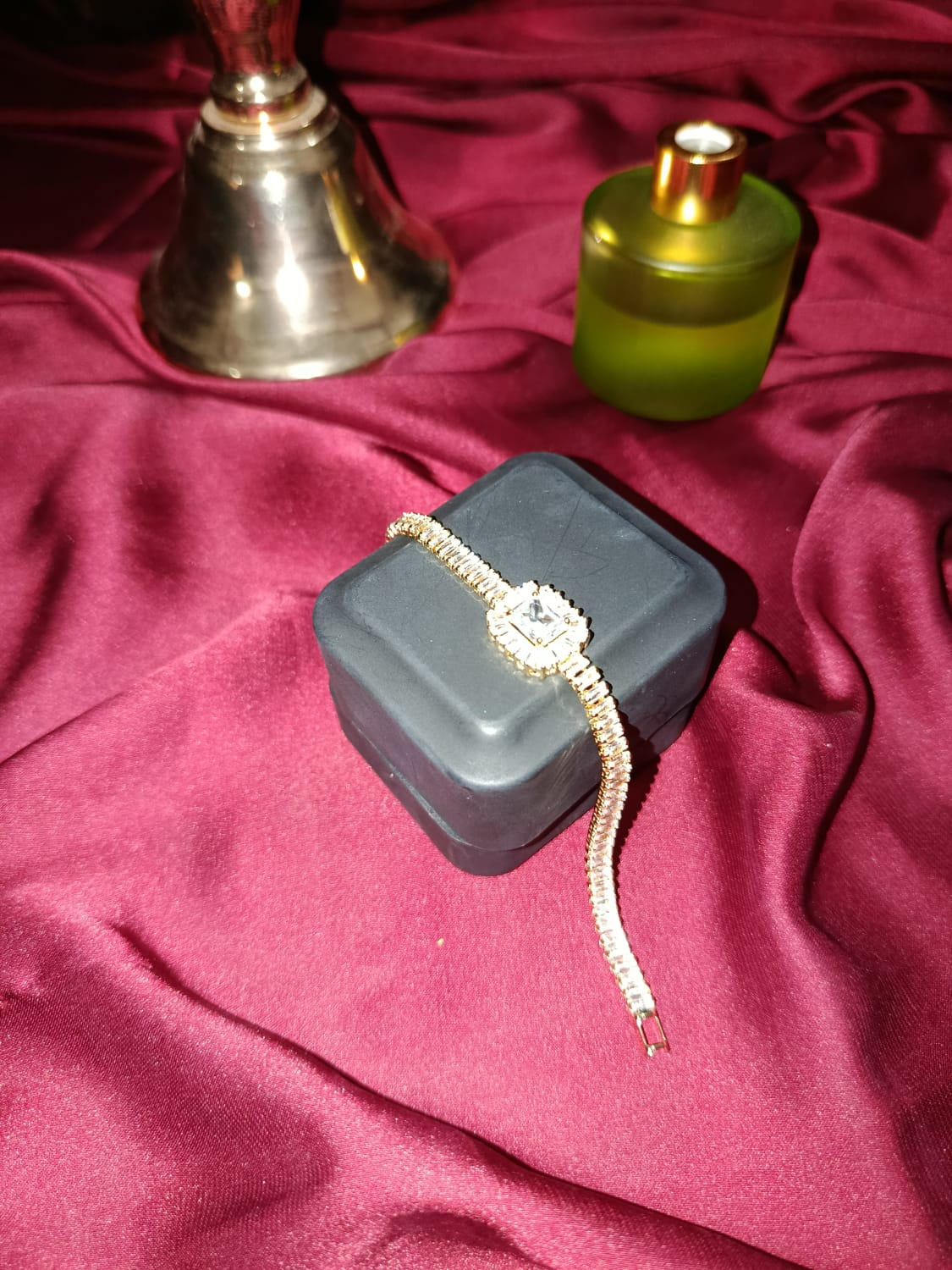 Grace your wrist with this Sparkling Golden-Tone 1ct Moissanite Bracelet, beautifully accented with square-cut 1ct Moissanite stones. Designed for effortless elegance, it combines timeless charm with modern simplicity. Whether you're dressing up for a special occasion or adding a touch of sparkle to your everyday look, this bracelet is the perfect accessory. Its lightweight yet durable build ensures lasting beauty, while the secure clasp keeps it in place all day long. Copper with Unique Plating